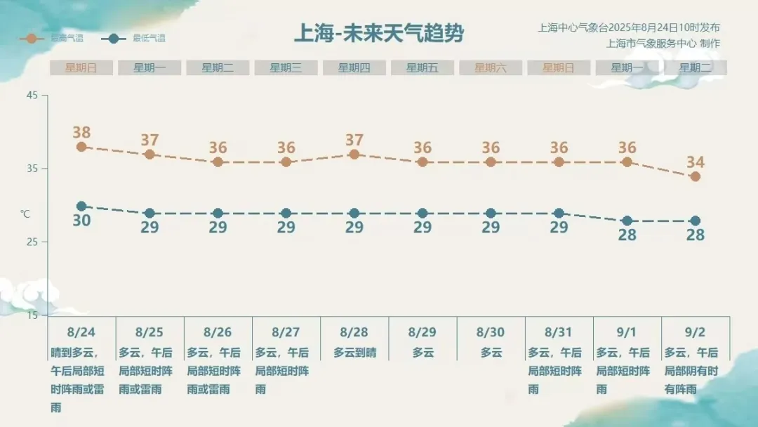 天气趋势:上海近期暑热炎炎,酷热无法撼动。一直到本月底,最高气温都维持在36~38℃,最低气温也接近30℃。“高温+午后雷阵雨”的熟悉配方也将延续,大家在防暑降温的同时,多多关注临近的预报预警信息。