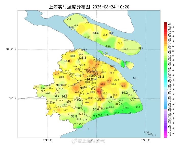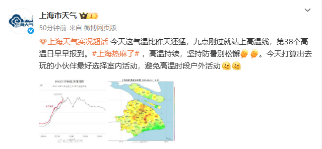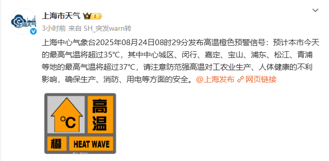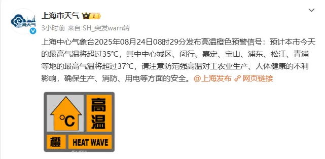 今天(8月24日)8时29分,上海中心气象台发布高温橙色预警信号:预计上海市当天的最高气温将超过35℃,其中中心城区、闵行、嘉定、宝山、浦东、松江、青浦等地的最高气温将超过37℃,请注意防范强高温对工农业生产、人体健康的不利影响,确保生产、消防、用电等方面的安全。